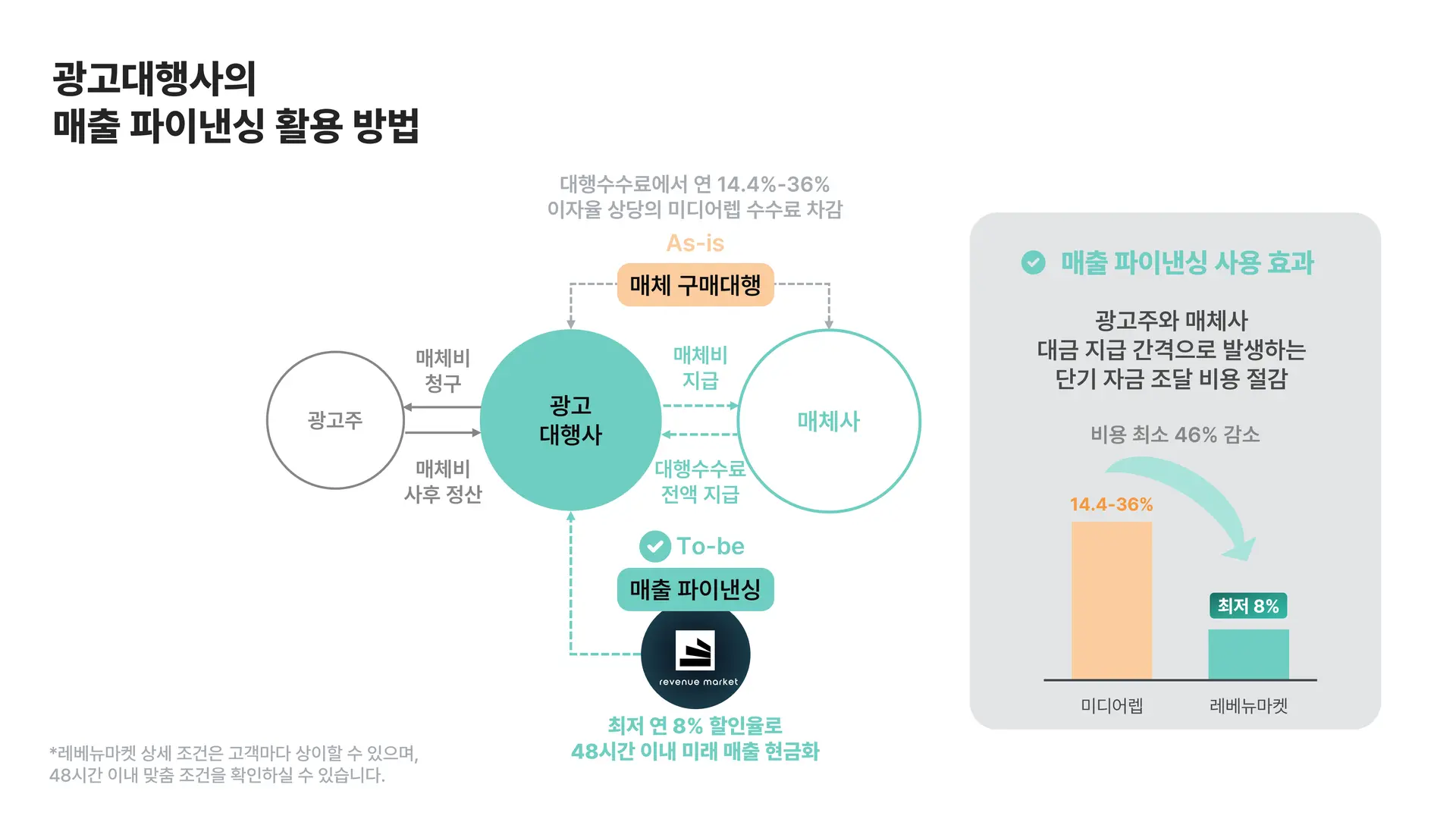 1️⃣ 매체비 확보: 미래의 매출을 현금화하여 선지급해야 할 매체비를 미리 확보할 수 있어요.