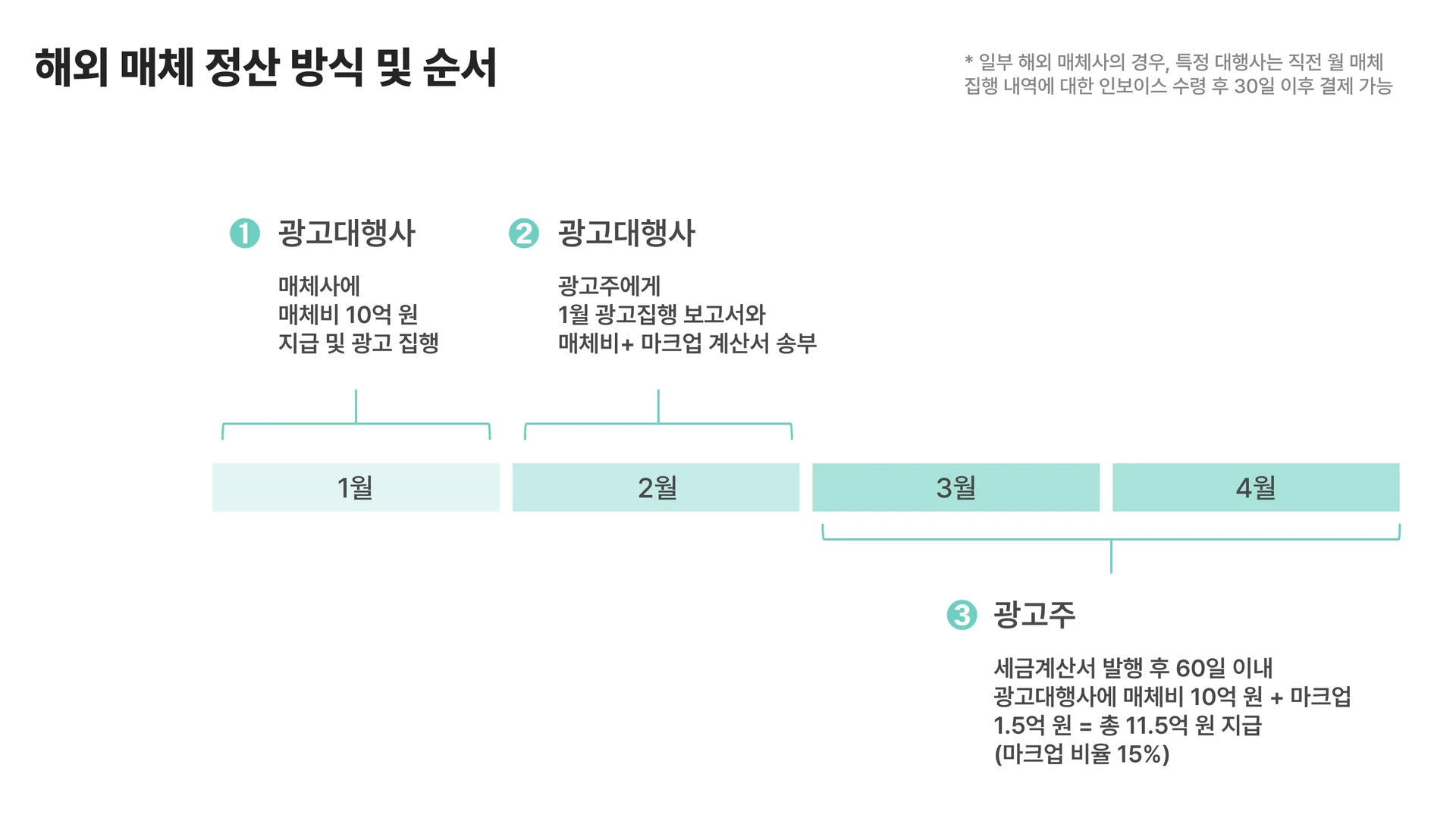 예를 들어, 광고대행사가 광고주의 요청을 받아 1월 1~31일 동안 국내 매체와 해외 매체에 각 월 10억 원의 광고를 집행했다고 해보겠습니다. 광고 대행 수수료(또는 마크업)는 모두 15%로 동일하다고 가정할 때, 광고대행사의 정산 방식 및 순서는 다음과 같습니다.