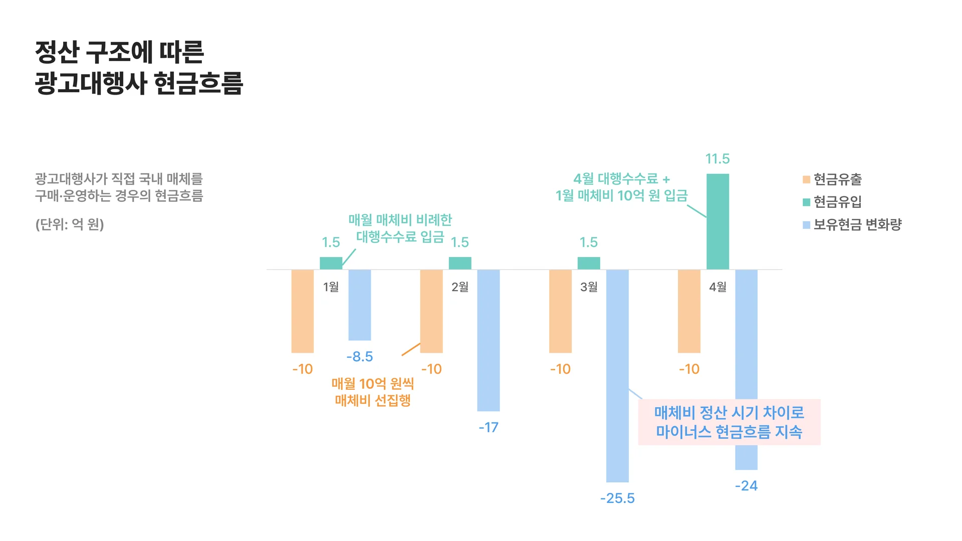 광고대행사가 1월부터 매월 10억 원씩 매체비를 지출하는 광고주를 영입했을 때, 해당 캠페인으로만 발생하는 광고대행사의 현금흐름 변화가 어떠한지를 그래프로 표시해 보았습니다. 매월 매체비로 월 현금유출은 10억씩 발생하지만, 대행 수수료를 통한 현금유입은 상대적으로 적어 지속해서 마이너스 현금흐름을 기록하는 것을 볼 수 있습니다. 매체비 정산이 되어야 현금흐름이 개선될 수 있는데, 1월에 집행한 매체비는 4월이나 되어야 입금되어 정산 시기 차이로 보유 현금이 계속 낮아지는 것을 볼 수 있습니다.