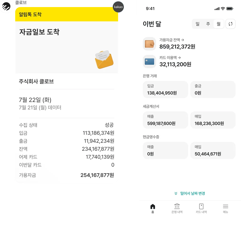개인 자산은 토스나 뱅크샐러드로 간편하게 보면서, 왜 법인 자금은 아직도 불편한 엑셀이랑 문자 알림에 의존해야 할까요? 클로브AI는 '법인판 오픈뱅킹'을 지향하는 무료 회계프로그램입니다.