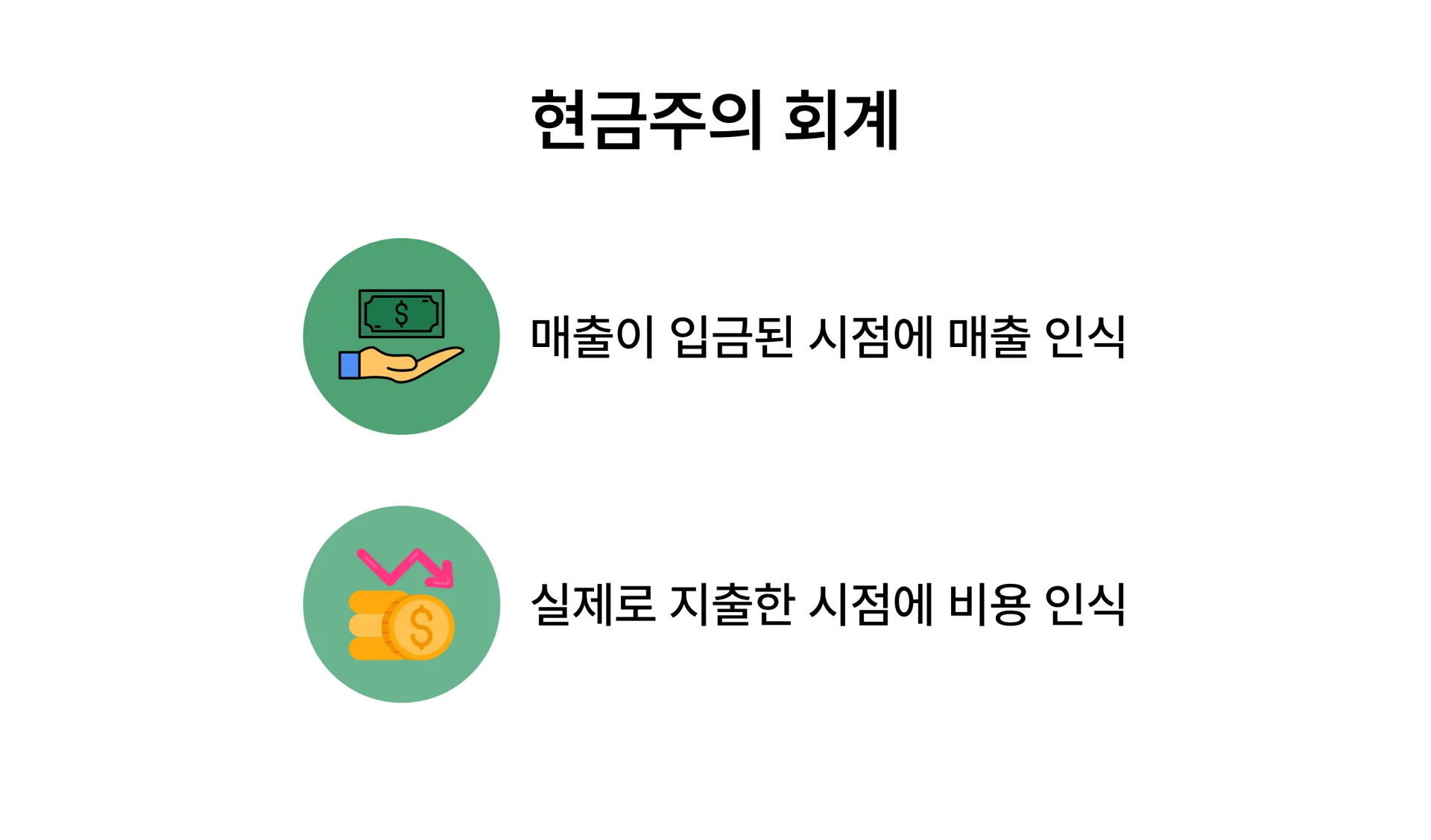 예를 들어 기업이 5월에 서비스를 제공하고, 6월에 돈을 받았다면 6월에 수익을 기록하고요. 비용도 마찬가지로, 어떤 제품을 5월에 구매하고 6월에 지불했다면 6월에 비용을 기록합니다.