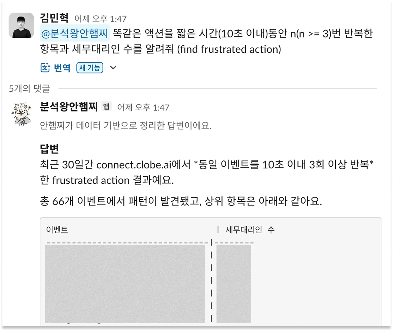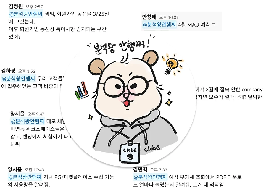이 고민 해결의 과정에서 클로브의 Analytics Engineer 안창배님의 유쾌한 아이디어가 더해졌습니다. 덕분에 딱딱했던 분석 업무는 팀의 일상 속에 자연스럽고 재미있게 스며드는 하나의 문화로 자리 잡게 되었습니다.