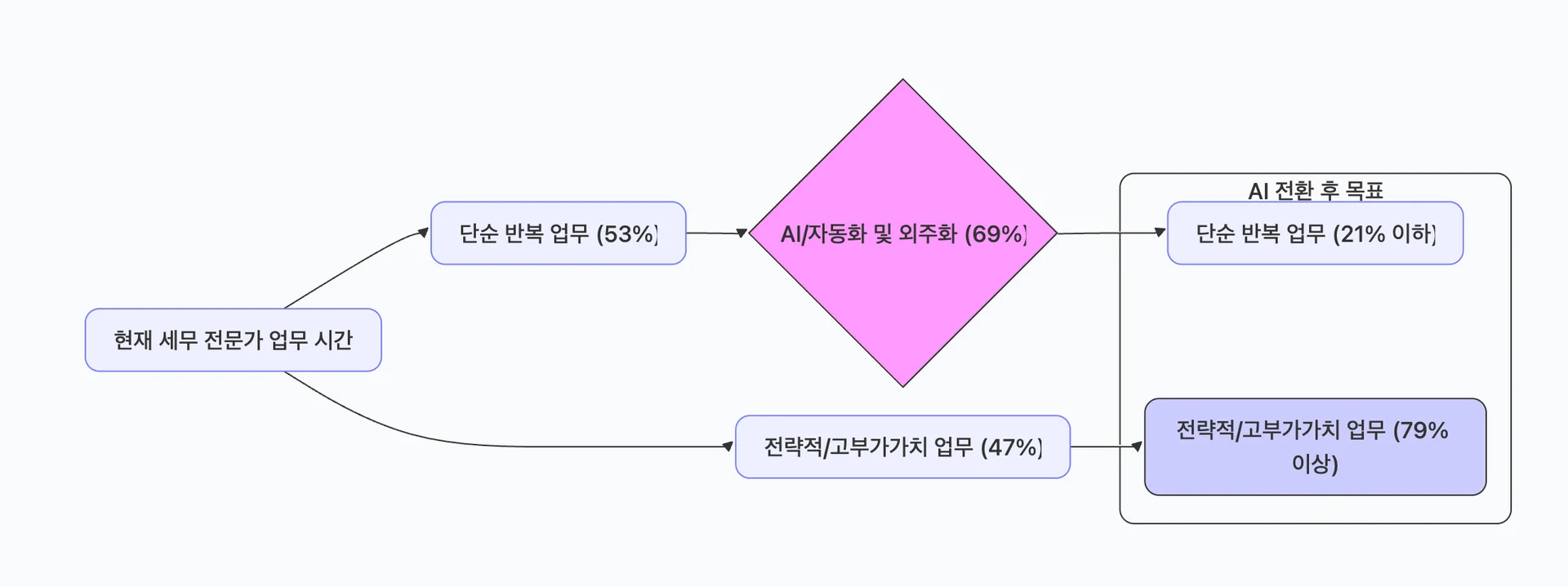 단순 반복 업무 비중 목표: 현재 세무 전문가들은 업무 시간의 53%를 단순 반복 업무에 사용하고 있으나, 이 비중을 21% 수준으로 낮추기를 희망합니다 .