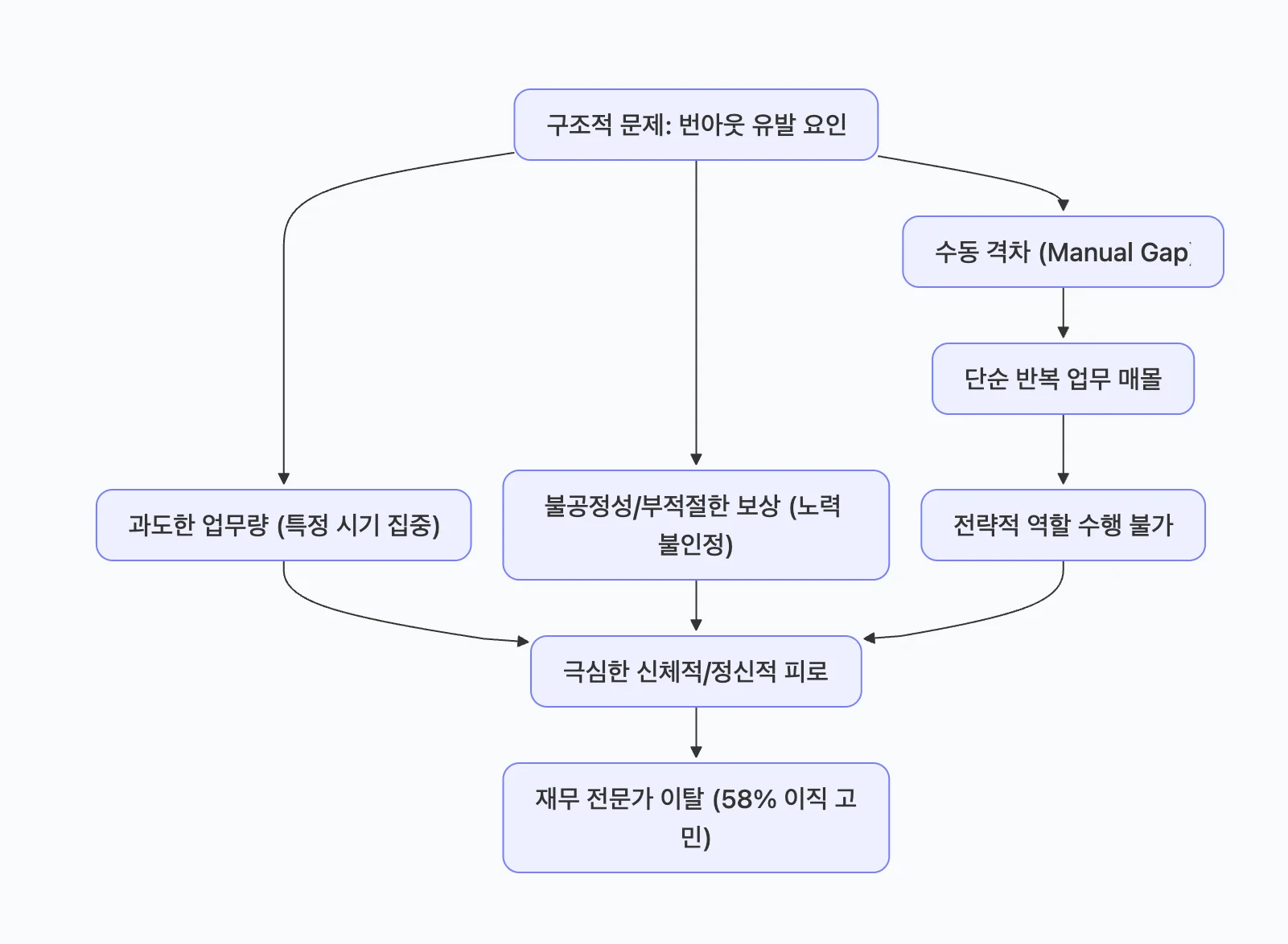 번아웃은 개인의 문제가 아닌, 조직 문화와 업무 환경에서 비롯되는 구조적 문제입니다. 특히 재무팀과 회계법인에서 번아웃을 유발하는 핵심 요인은 다음 6가지로 요약됩니다 .