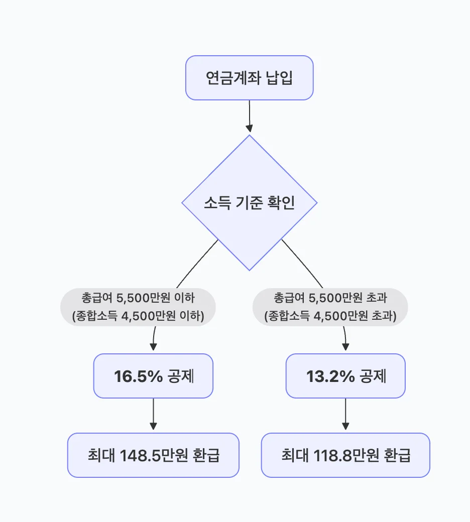 16.5% 적용 시: 900만 원 납입 시 최대 148만 5천 원 환급