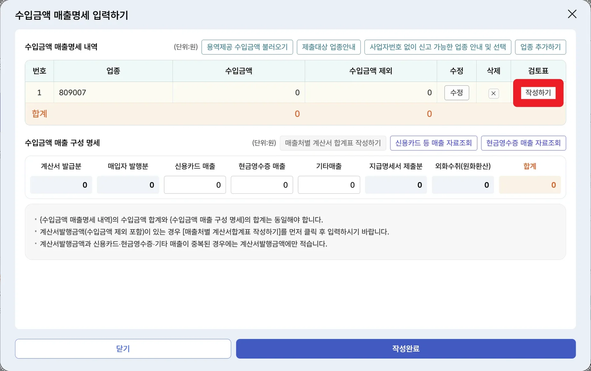 2) 기본 정보를 입력한 후 수입금액 매출명세 [작성하기]를 클릭합니다.
