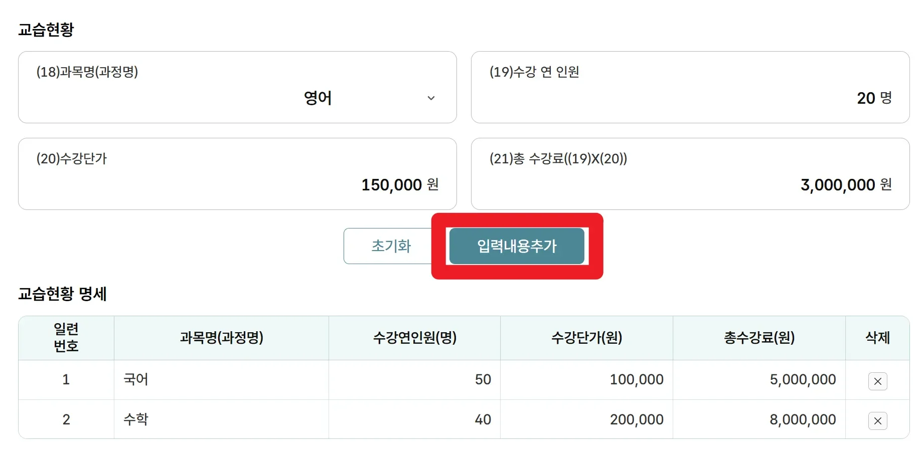이 중에서 ‘교습현황’을 자세히 알아보겠습니다. 과목명, 수강단가와, 수강 연 인원, 총 수강료를 작성한 후 [입력내용추가]를 클릭하면 바로 아래 ‘교습현황 명세’에 해당 내용이 추가됩니다.