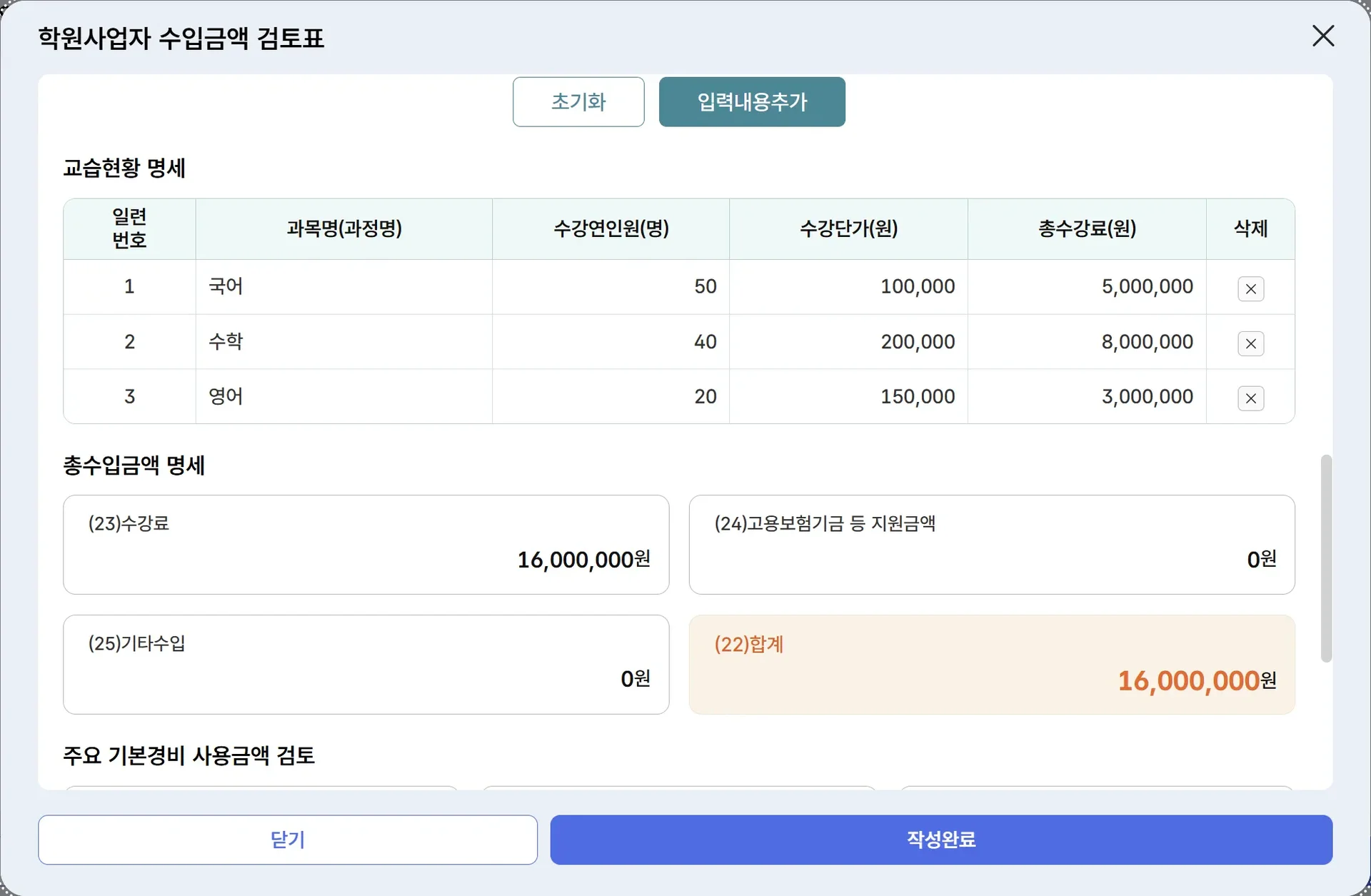 교습 현황: 과목명, 수강 단가, 연 수강 인원을 입력하여 총 수강료를 산출합니다.
