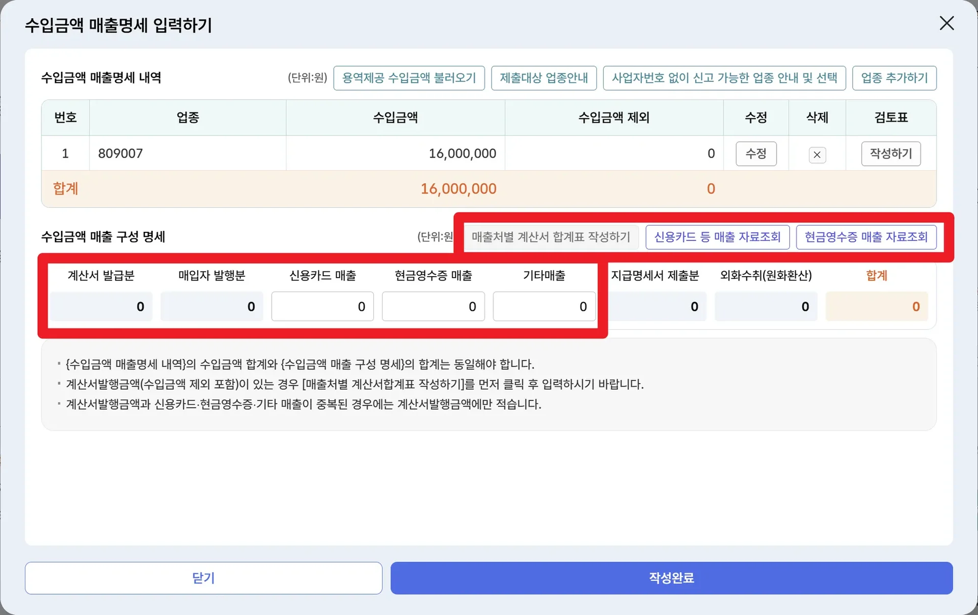 상단에 계산된 총수입금액은 아래 세 가지 자료의 합계와 반드시 일치해야 합니다.