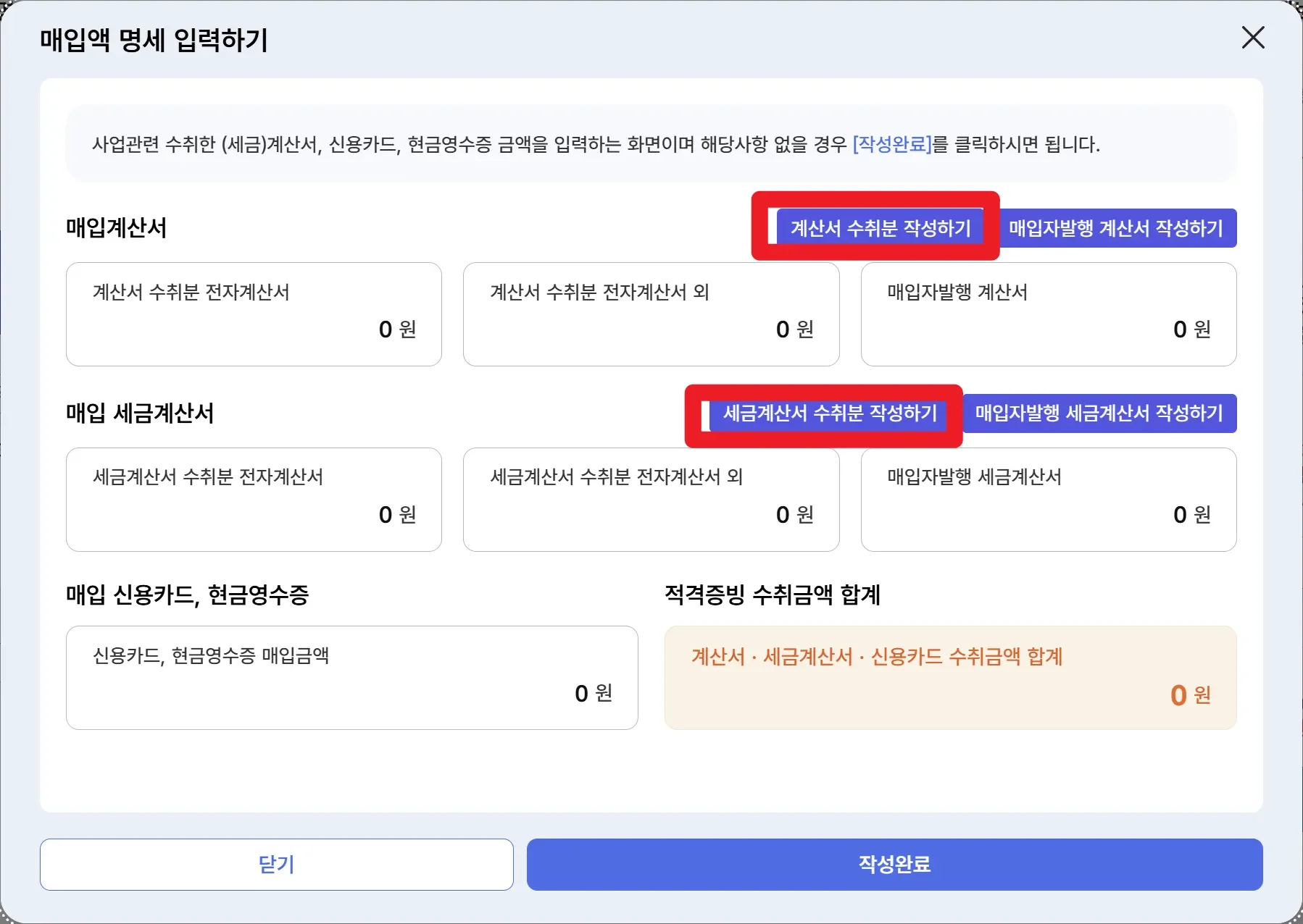 지출한 비용에 대해 세금계산서, 계산서, 사업용 신용카드, 현금영수증 수취분을 각각 조회하여 입력합니다.