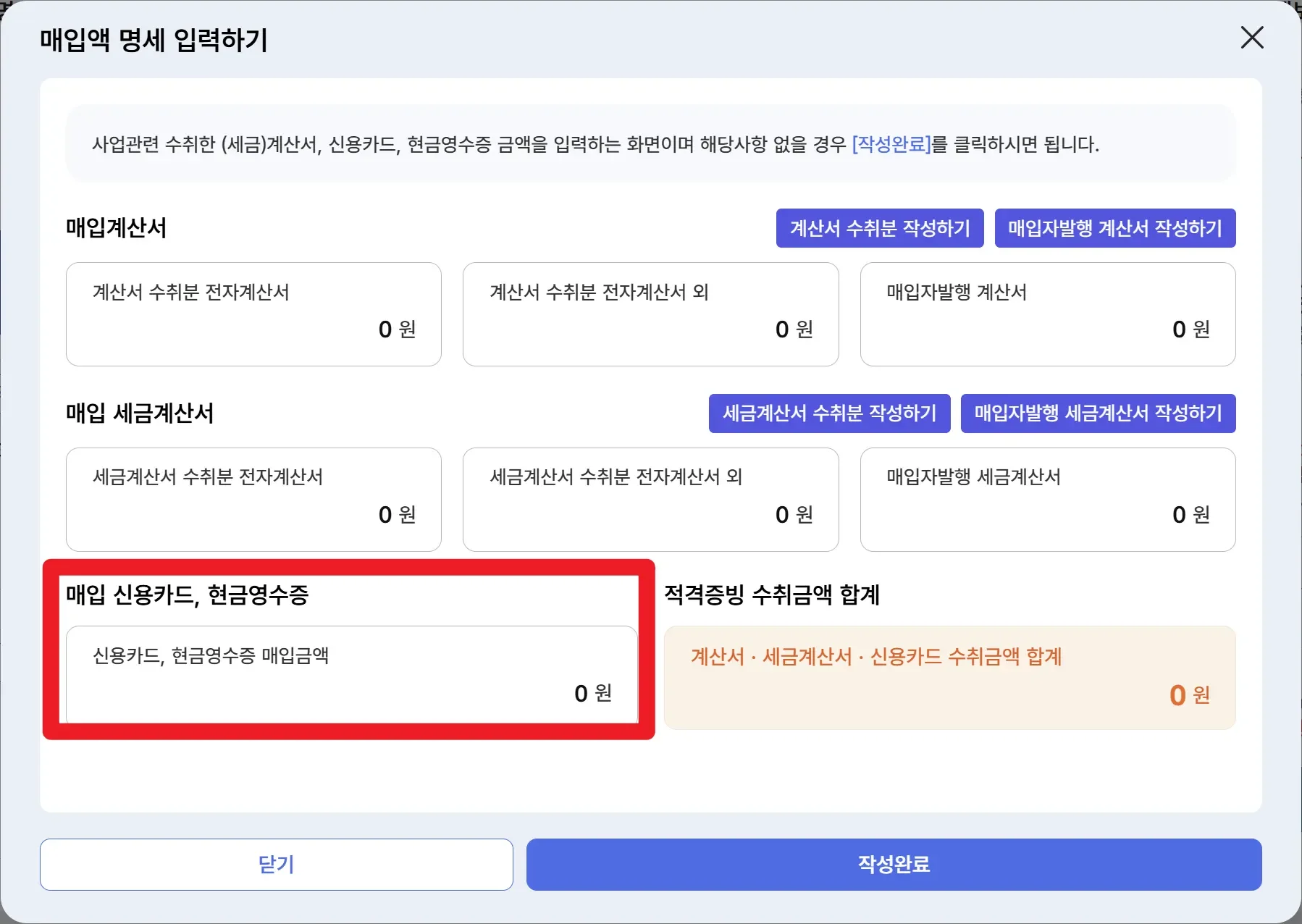 ‘매입 신용카드, 현금영수증’란에는 사업용신용카드, 사업용신용카드 외의 카드로 사용한 내역, 현금영수증을 발급받고 사용한 내역에 대해 작성한 후 [작성완료]를 누르면 됩니다.