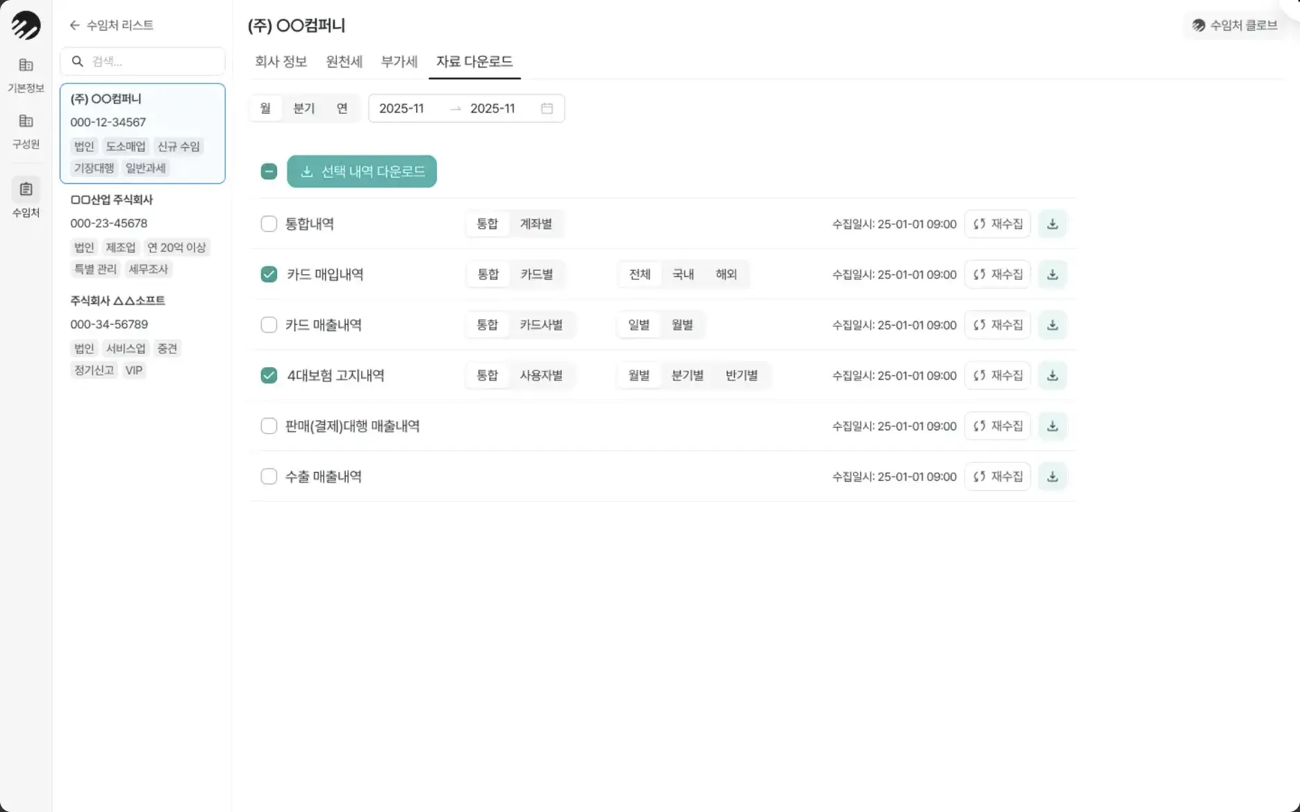자료 요청의 종말: 누락된 데이터는 시스템 내에서 즉시 재수집이 가능하므로, 고객사 담당자에게 번거롭게 자료를 다시 요청할 필요가 없습니다 📈