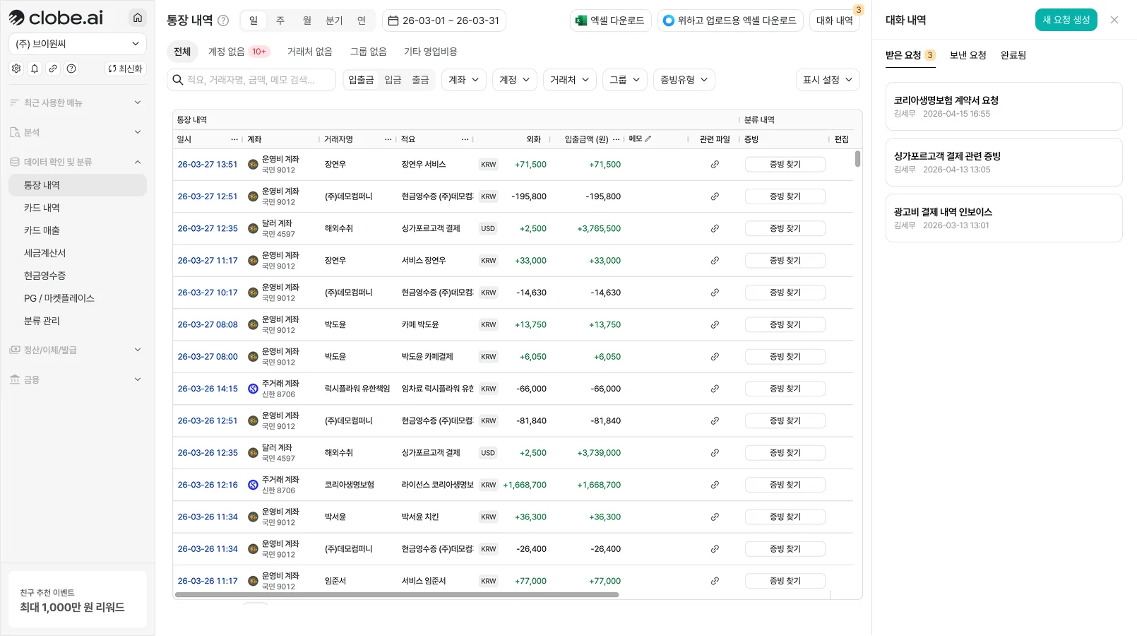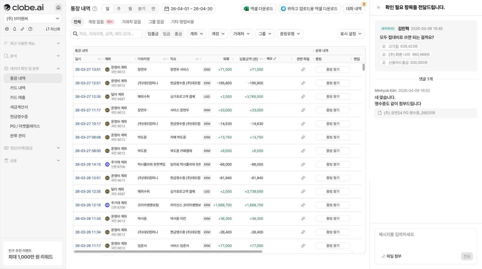 맥락 중심의 소통: 이제 클로브AI 통장내역에서 특정 거래 내역을 열고, 그 자리에서 즉시 세무대리인과 메시지를 주고받을 수 있습니다.