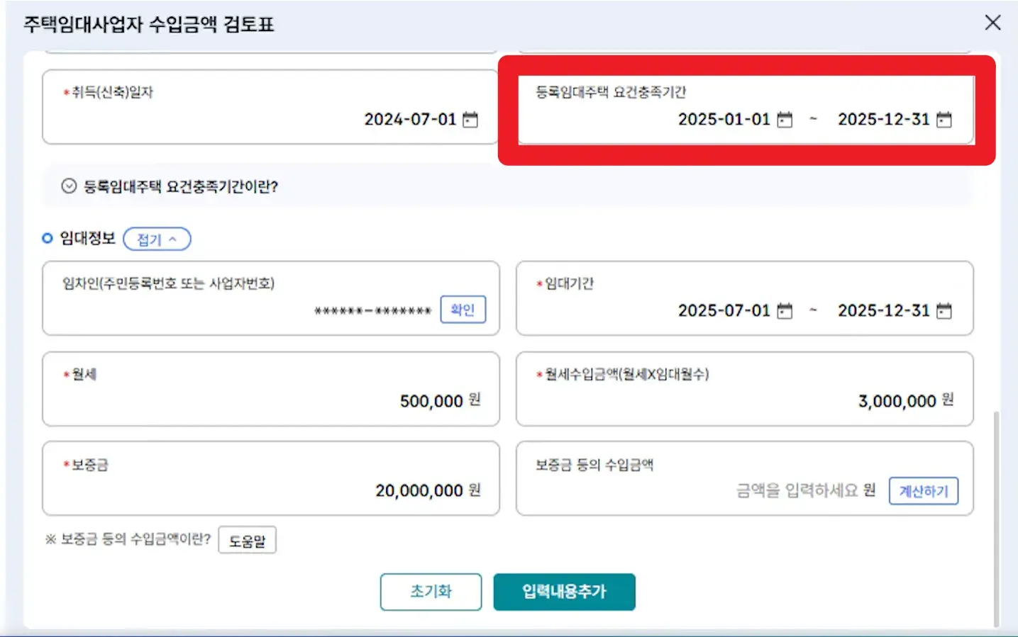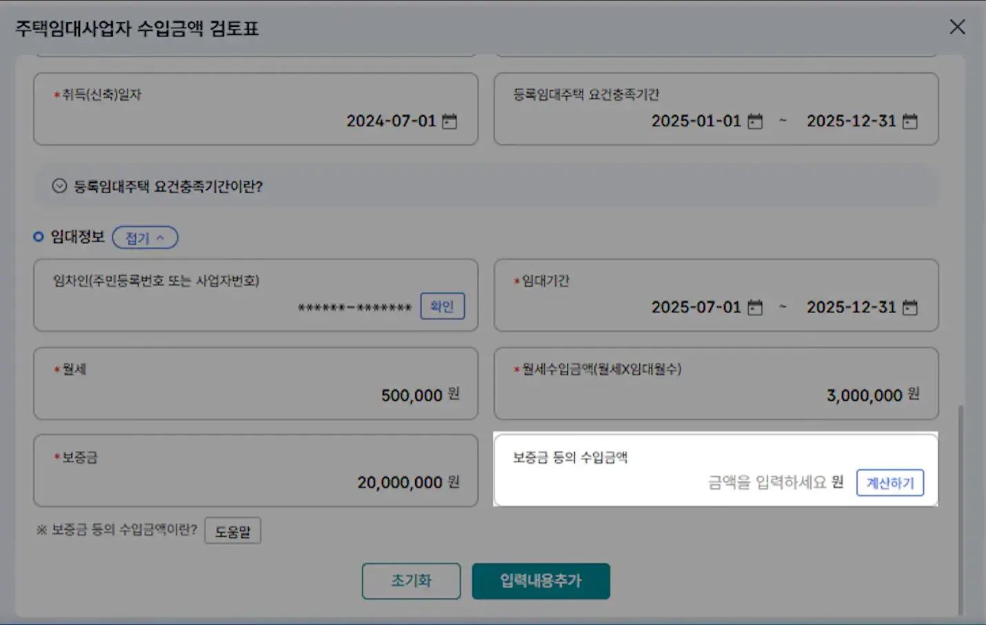 해당 주택의 임대 기간과 월세를 입력하면 연간 총액이 자동으로 계산됩니다. 실제 통장에 입금된 시점이 아닌 '임대차 계약서상 기간'을 기준으로 입력해야 함을 유의하세요.