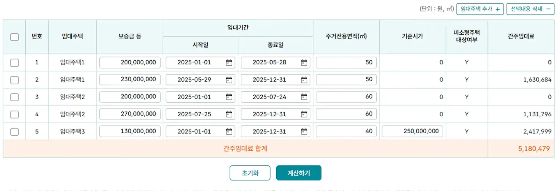 임대주택3 | 40 | 2억 5천만 원 | 1월 1일 ~ 12월 31일 (365일) | 1억 3천만 원 |