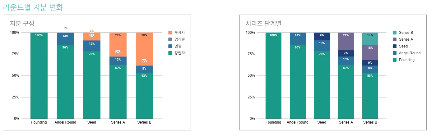 투자 라운드에 따른 지분, 기업가치의 변화를 한 눈에 쉽게 파악할 수 있도록 시각화한 그래프를 제공합니다.
