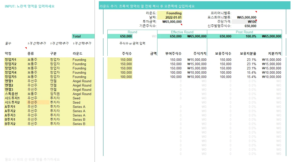 템플릿 시트 중 사용자가 직접 입력해야 하는 유일한 시트입니다. 라운드별 프리머니밸류와 해당 라운드에 포함된 주주에게 제공된 주식 수 또는 금액을 입력하면 다음의 값이 자동으로 계산됩니다.