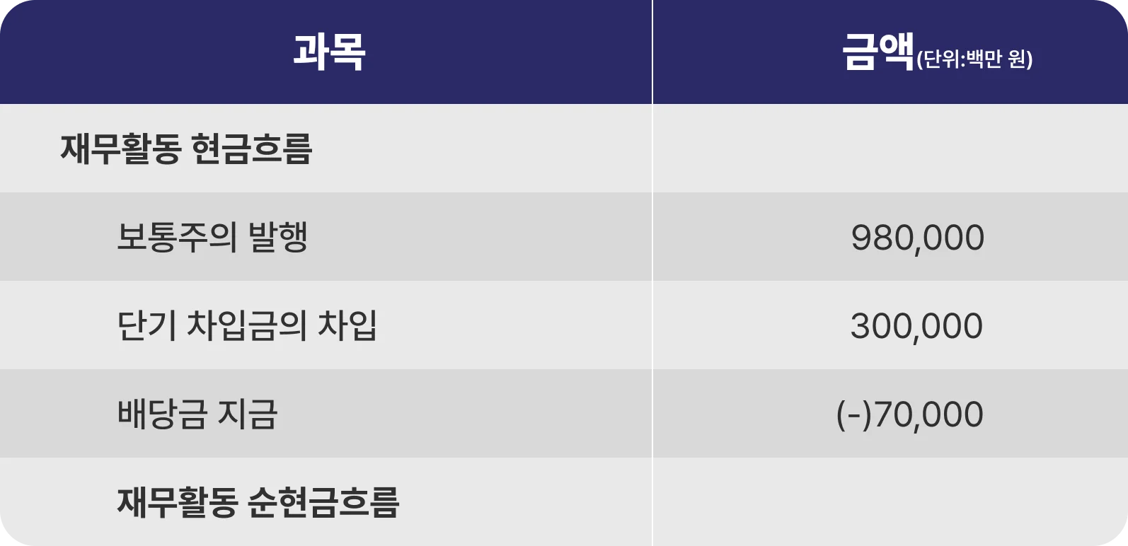 재무활동 현금흐름은 대출, 투자 유치, 상환, 배당 등 외부 자금과 관련된 모든 흐름을 보여줍니다.
