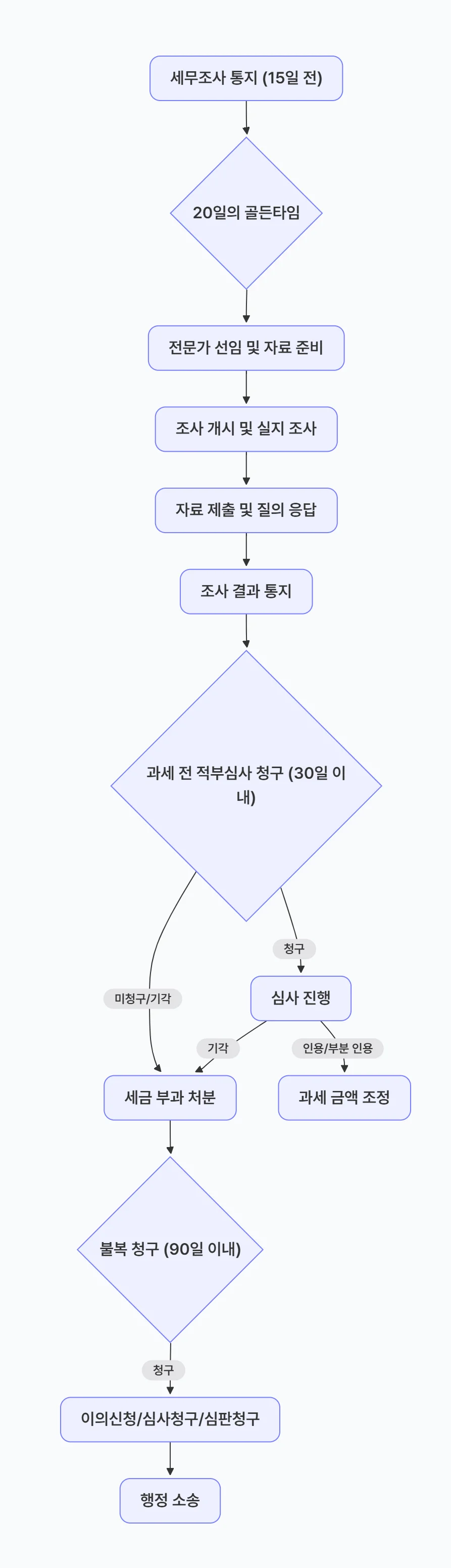 세무조사의 전체적인 흐름을 시각적으로 파악하면 대응 전략을 세우는 데 도움이 됩니다.
