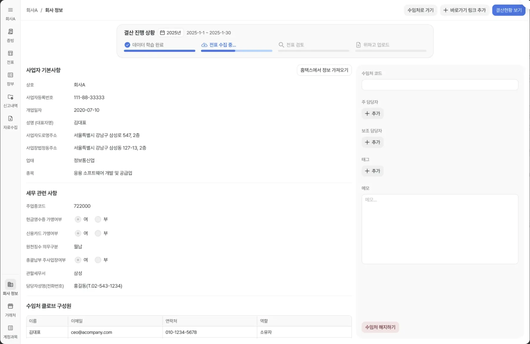 홈택스 기반으로 수임처 목록을 자동 호출하고, 각 업체별로 담당자, 태그, 메모, 전용 커뮤니케이션 채널을 통합 관리합니다.
