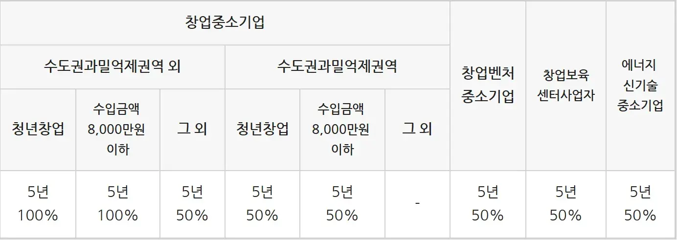 지역(수도권 과밀억제권역): 사업장이 수도권 과밀억제권역 '밖'에서 창업할 경우 감면율이 높게 적용됩니다.